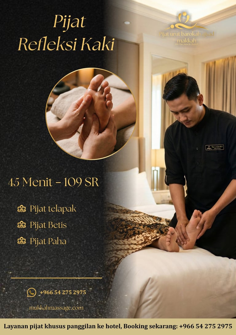 Kami hadir Dengan teknik pijat yang efektif tradisional dan pelayanan yang ramah, tubuh Anda akan kembali bugar, segar, dan siap melanjutkan ibadah. Rasakan sensasi relaksasi yang membantu perjalanan spiritual Anda lebih ringan dan nyaman. Layanan pijat kami siap datang langsung ke lokasi Anda.