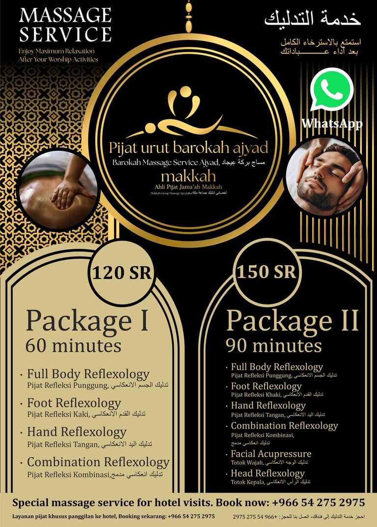 We are here With traditional effective massage techniques and friendly service, your body will be fit, fresh, and ready to continue worship. Feel the sensation of relaxation that helps your spiritual journey lighter and more comfortable. Our massage service is ready to come directly to your location.